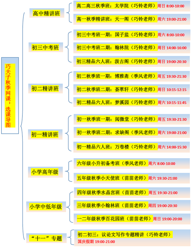 【巧夫子】2018-19学年秋季班详细课程表
