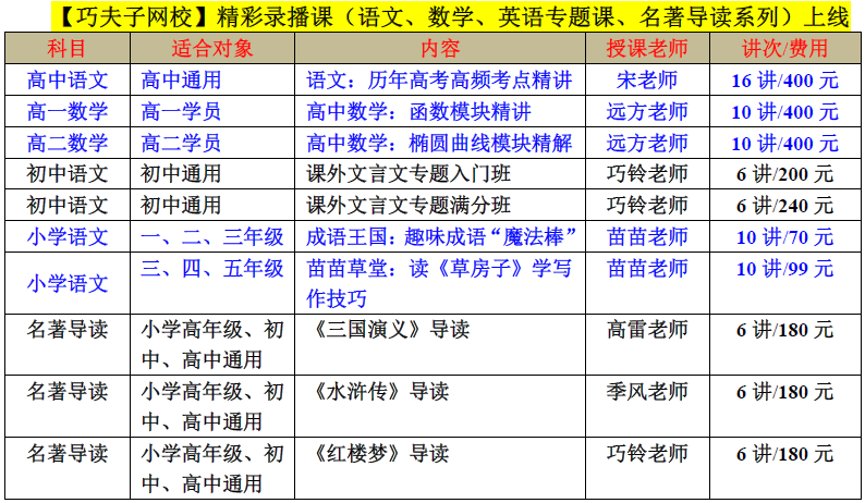 寒假将至,巧夫子网校推出精彩点播课!内容包括:高中语文专题精讲,初中课外文言文专题、小学写作技巧、文学名著导读、高中数学复习进阶系列。