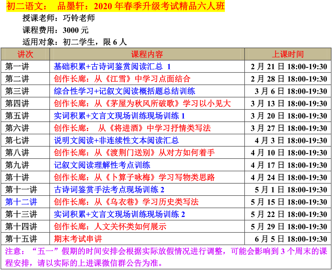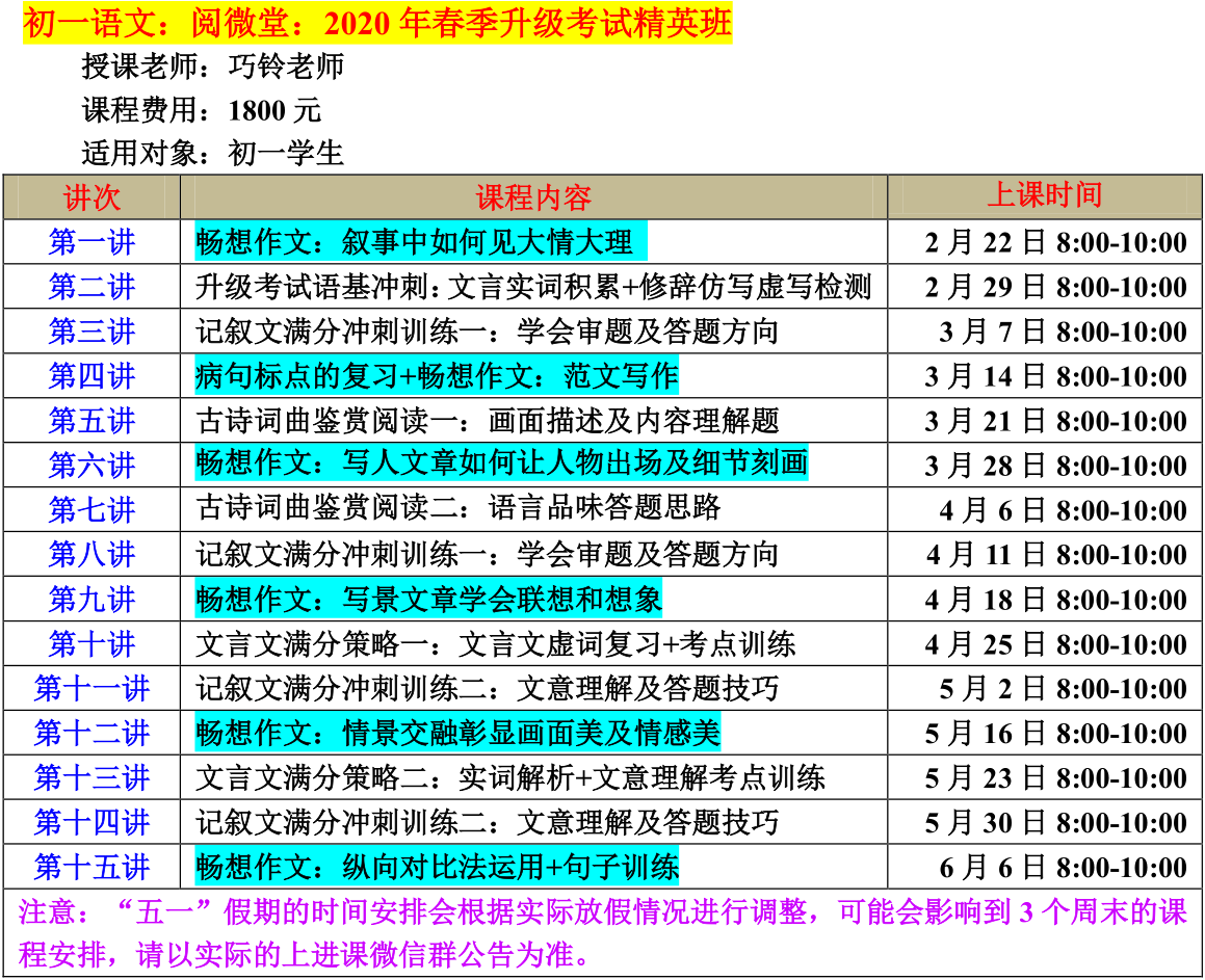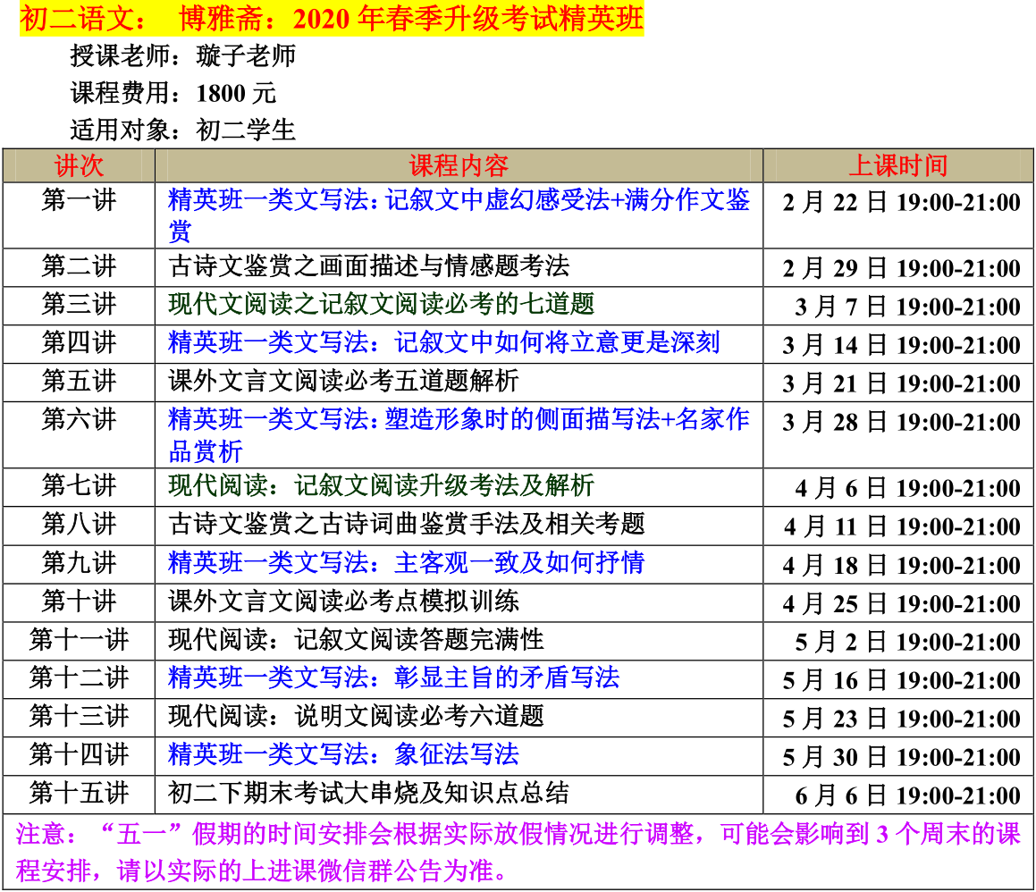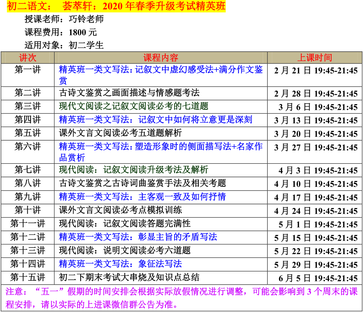 【巧夫子网校】2020学年春季语文直播课程大纲