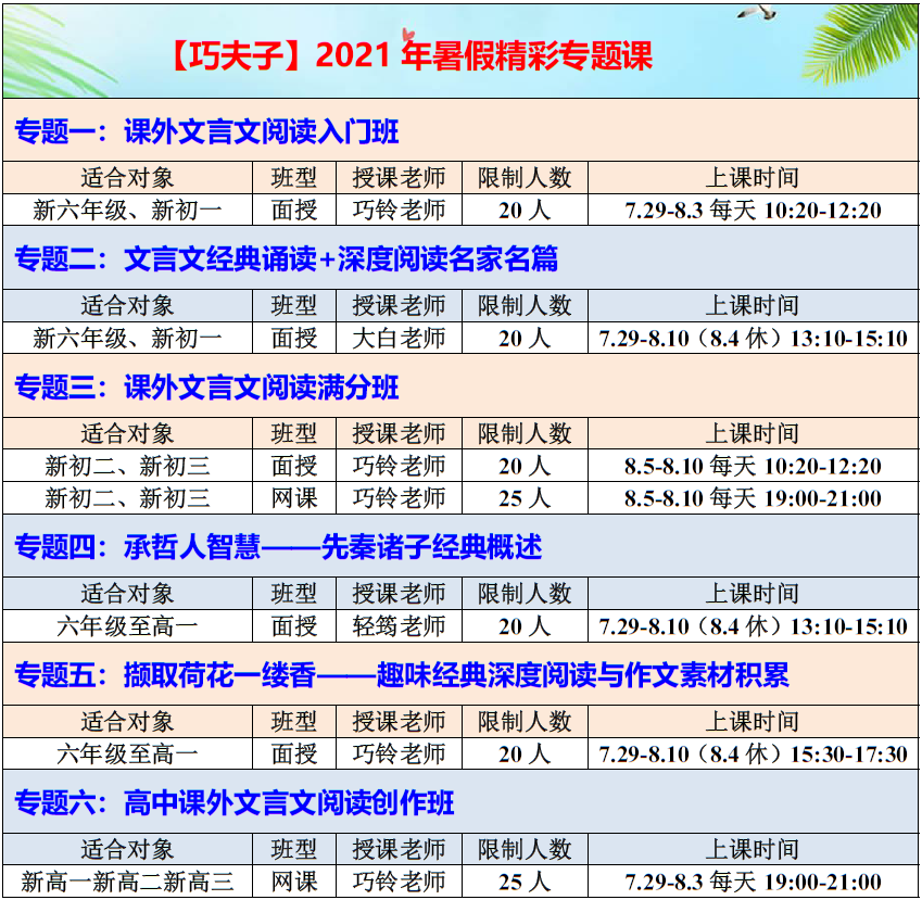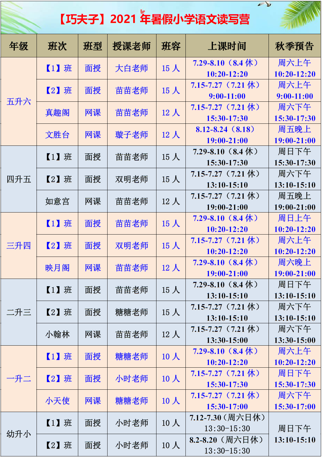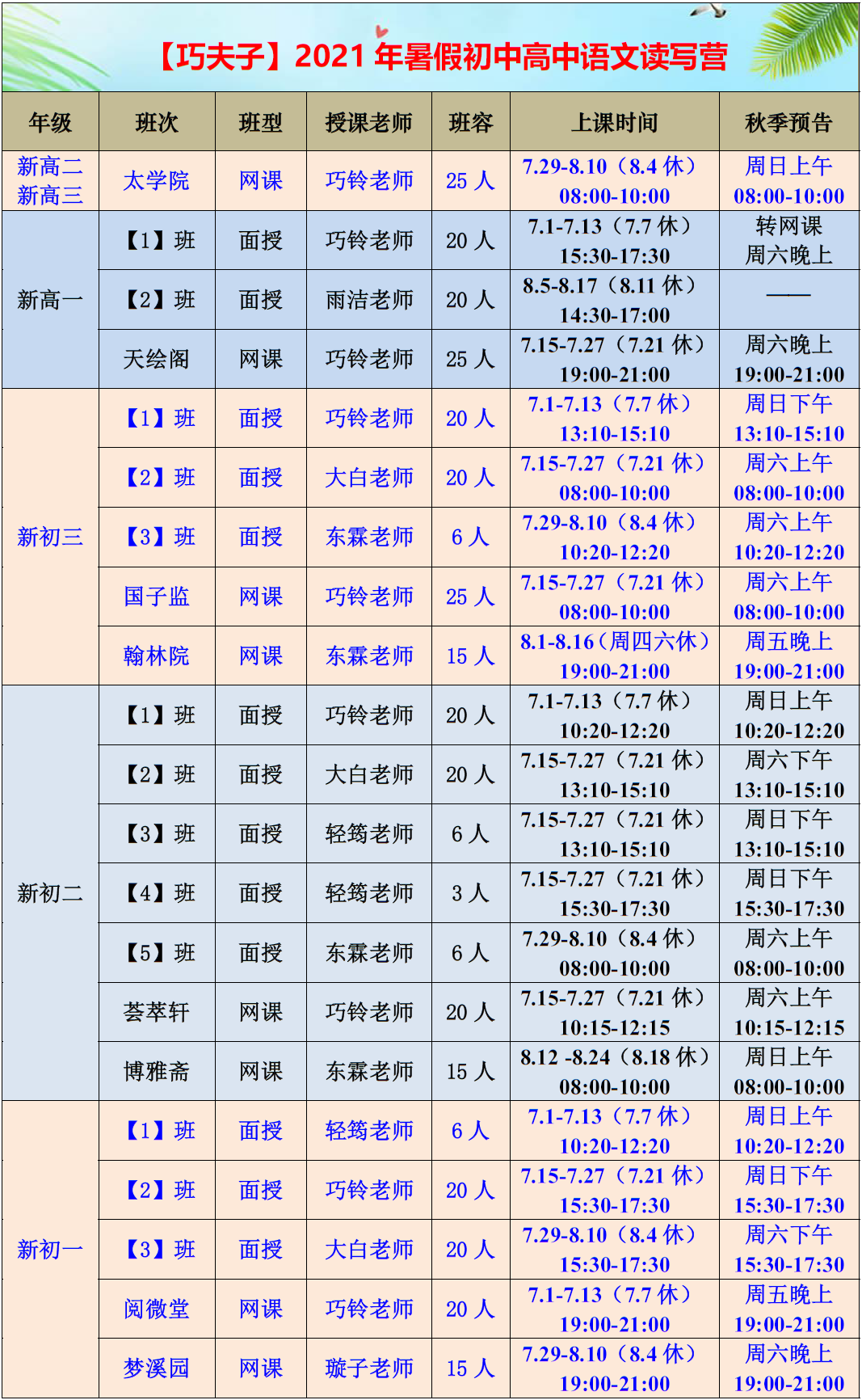 提前预告一下2021年暑假班、秋季班的语文课程各班次的时间安排: